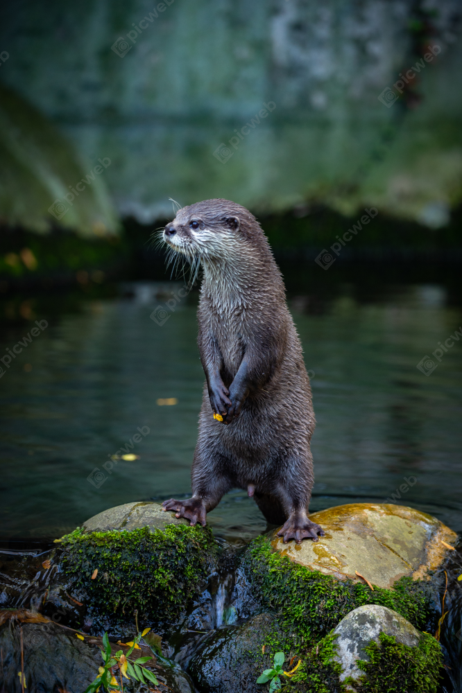 На этом изображении представлена азиатская мелкоклювая выдра, стоящая перед камерой в своей природной среде обитания в зоопарке. Выдра с характерной формой тела и выразительными глазами выглядит любопытной и игривой, что делает кадр особенно привлекательным. Окружающая среда, оформленная с учетом естественного обитания, включает в себя камни, воду и растительность, создавая атмосферу, близкую к дикой природе. Это изображение не только демонстрирует красоту и грацию этих удивительных животных, но и подчеркивает важность сохранения их естественной среды обитания. Идеально подходит для использования в материалах о дикой природе, зоопарках и охране окружающей среды, этот кадр вдохновляет на изучение и защиту уникальных видов.