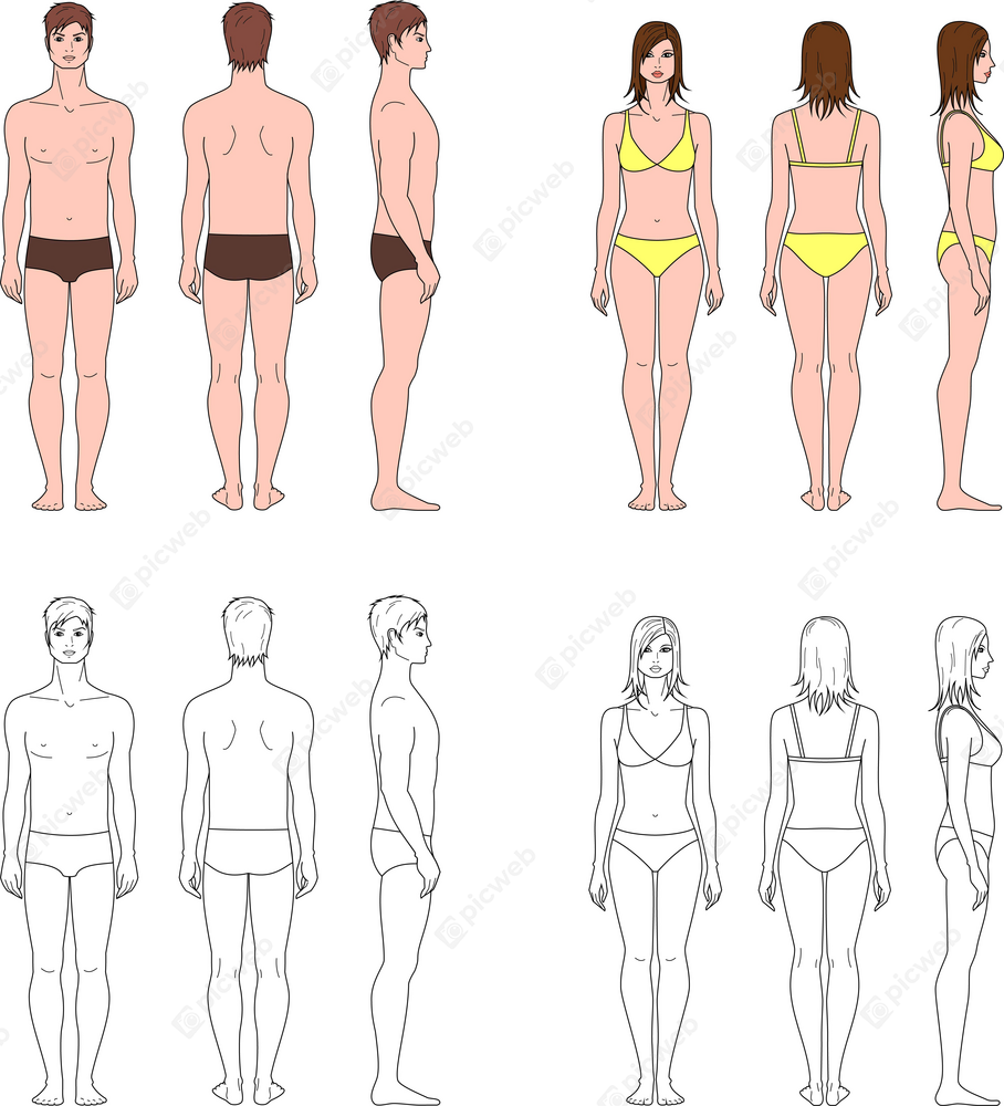 Это изображение представляет собой анатомические фигуры человека, расположенные в верхней части, где мужская фигура находится слева, а женская — справа. Каждая фигура показана в нескольких ракурсах: спереди, сбоку и сзади, что позволяет детально рассмотреть их форму и пропорции с разных сторон. Мужская фигура одета в темные плавки, а женская — в яркий желтый купальник, что добавляет визуального интереса и контраста. Верхняя часть изображения выполнена в цвете, в то время как нижняя часть представлена в виде контуров в черно-белом стиле, где фигуры также изображены в разных ракурсах. Это оформление делает изображение удобным для дизайнеров, художников и стилистов, позволяя им изучать анатомию и пропорции человеческого тела. Оно может быть использовано в образовательных материалах, художественных проектах или в качестве справочного пособия для профессионалов в области моды и дизайна.
