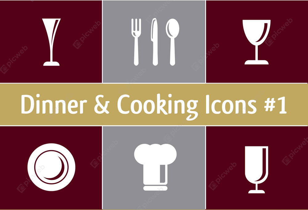 Это стильное изображение, разделенное на шесть квадрантов, идеально подходит для кулинарных и ресторанных тем. Каждый квадрант окрашен в разные цвета: бордовый и серый, что создает интересный контраст и привлекает внимание. В первом бордовом квадранте изображен бокал или фужер, во втором сером — набор столовых приборов, включая вилку, нож и ложку, что подчеркивает тему еды. Третий квадрант снова бордового цвета содержит чашку или бокал, а четвертый серый — шапку повара, символизирующую кулинарию. Пятый квадрант представляет собой тарелку, а шестой — дополнительный бокал или фужер. Внизу изображения расположен текст "Dinner & Cooking Icons #1", выделенный золотистым фоном, что добавляет элегантности. Это изображение станет отличным выбором для использования в меню, рекламных материалах ресторанов или кулинарных блогах, подчеркивая современный и минималистичный стиль.