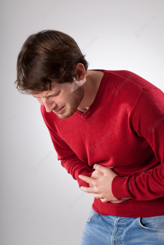 Мужчина с каштановыми волосами, одетый в яркий красный свитер и синие джинсы, стоит с опущенной головой, прижав руки к животу. Его выражение лица передает глубокое чувство боли или дискомфорта, что делает изображение особенно эмоциональным и выразительным. Фон в виде простой серой стены создает нейтральную атмосферу, позволяя сосредоточиться на переживаниях героя. Это фото может быть использовано в различных контекстах, таких как статьи о здоровье, психологии или эмоциональном состоянии. Оно также подойдет для иллюстрации тем, связанных с личными переживаниями и внутренними конфликтами, что делает его универсальным для многих проектов.